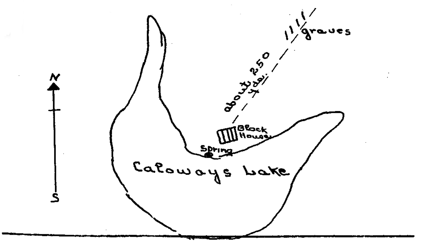 . . . . . The old "Blook House" of Birds Fort was constructed of logs. The outer walls were constructed in pickett [sic] form, Logs set on ends, with deep entrenchments all around the Building--These trenches were plainly visable [sic] up to the time when the Caloway Lake Club, constructed a pavilion or swimming pool on the ground where the Block House stood, and destroyed most of the evidence of these Trenches. If the Club's pavilion is still in Existance, then you can locate the ground of the old "Fort Bird".--Mrs. Annie Wallace Yates, who lives in Fort Worth or vicinity, used to live at the Lake & may be able to locate the grounds of the Fort. . . . .11