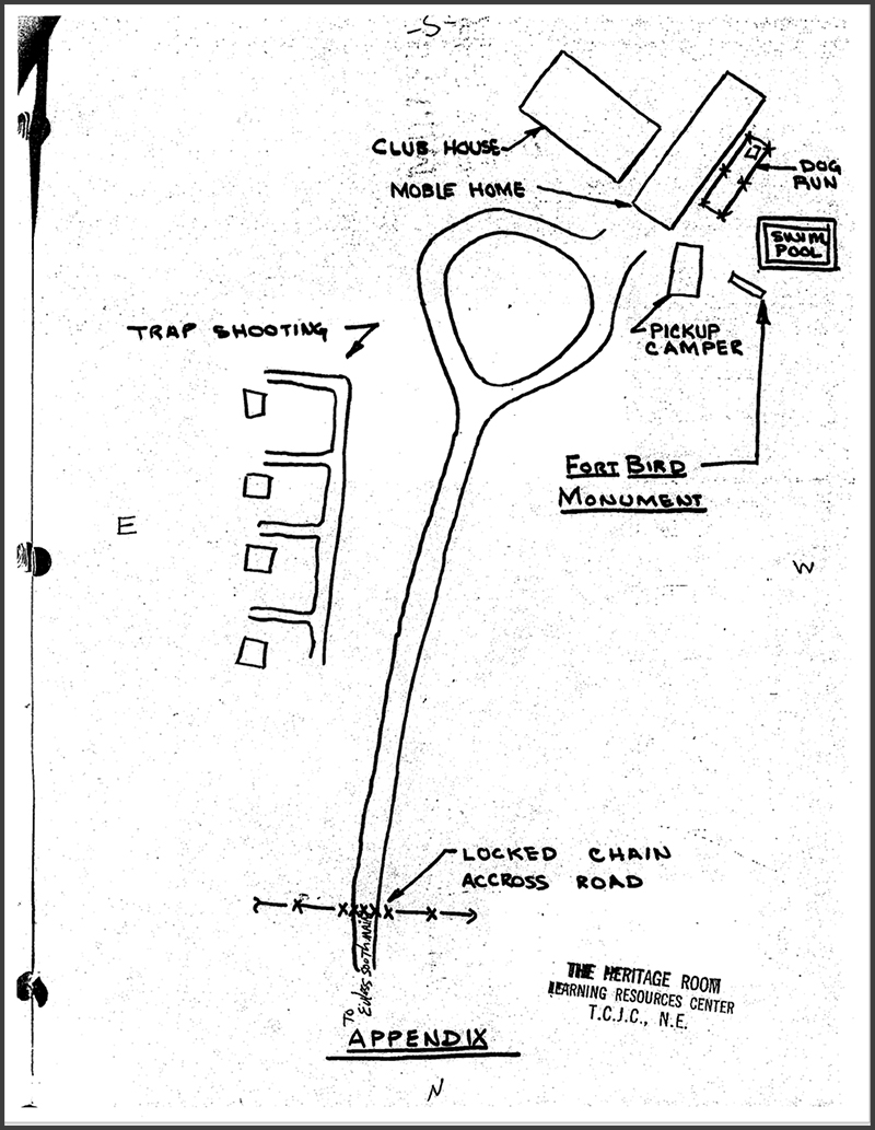 At the present time, Fort Bird is located on 118 acres of land occupied by Mr. and Mrs. D. R. Page, who are caretakers for the property owned by Charles Armentrout of Dallas. Immediately prior to the property being leased by Mr. Armentrout, to the Arlington Sportsman's Club, Fort Bird was readily accessible to the public. Today the privilege of visiting the Fort is by appointment only, at the convenience of the Pages.