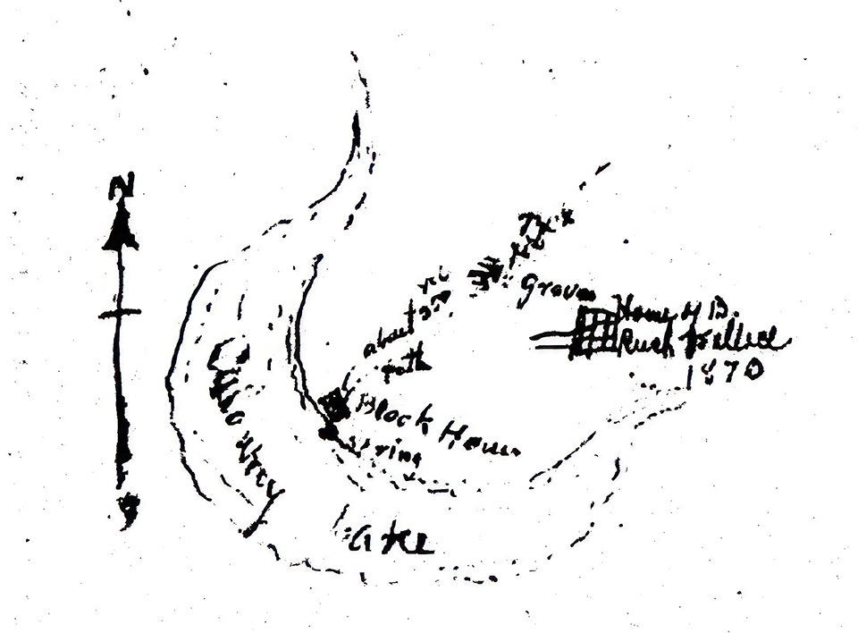 Col. Wallace told me the history of the place, and said that the first person buried there was killed by the Indians when he ventured out from the "Block House" to go to the spring for water, while being besieged by the Indians, the spring was at the edge of the lake about 30 or 40 yards from the Block House known as "Bird's Fort"—